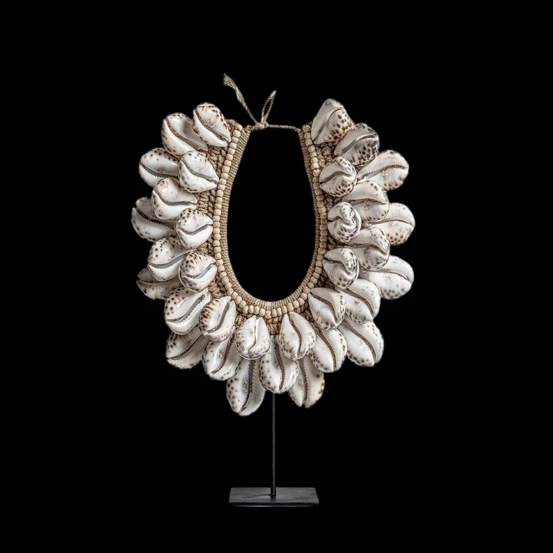 This product is a decorative tribal necklace made from natural seashells, often referred to as a ORIGINAL cowrie shell MOTIF ceremonial collar or ethnic shell necklace on stand.